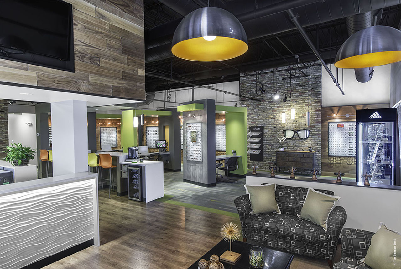 In Downers Grove, Midwest Eye Clinic was designed by CVG Architects with customer appeal as a central tenet. Exposed brick, a bold color scheme, and an open, loft-like design together provide visual interest and a unique experience for staff and customers alike. The space – which is part retail store, part optometrist’s office – has a residential feel with a variety of settings and seating options. The client specifically understood the need for customers to stay connected through technology during their visit; so, a data and recharging bar were integrated into the plan. Adding to this, Midwest Eye Clinic is actively engaging with customers on social media using quirky posts that play on memorable references to popular movie posters and album covers. Customers enjoy responding online and many have come up with ideas or even props for the staff to use on future promotions, thereby extending the online experience to in-person interactions.