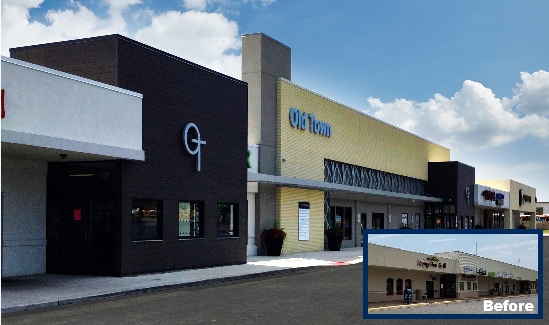 The family-owned Old Town Mall in Davenport, Iowa was recently revitalized through design enhancements by CVG Architects – responding to a new generation of ownership and a desire to maintain the mall’s viability within a competitive retail landscape. The dated facility included both an interior ring mall, and in-line stores facing a major thoroughfare. The owners were looking to update the mall’s overall aesthetic to align with modern design trends. CVG Architects transformed the facility into a visual landmark by designing a main building element, anchored at each end by two entrances to the internal mall, to result in central focal point with flanking, identifiable building masses. A brand-new façade and accentuated entrances to the inner mall were achieved through use of cost-effective materials with a high-end look, including stucco, faux brick in complementary colors, and faux wood paneling. Height changes along the façade were implemented to add interest and draw attention toward the inner mall. CVG Architects also designed a custom Old Town Mall Logo to assist in the creation of a new identity for the revitalized mall, which is now commanding higher rents and has reduced vacancies.